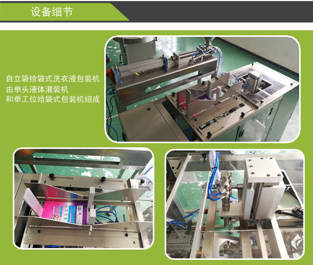 全自動自立袋洗衣液灌裝機是星火新研發(fā)的一款產(chǎn)品,上袋、定量灌裝、封合、切膜、自動計數(shù)一次性自動完成,工藝流程部位采用不銹鋼制造,包裝袋熱合、送袋長度、包裝重量、加熱溫度的調(diào)整,簡便可靠,連續(xù)灌裝精度高,包裝速度快,維修方便,是用戶致富選擇的理想設備。包裝產(chǎn)品美觀牢靠,外殼、管道、定量泵采用不銹鋼結(jié)構(gòu),確保衛(wèi)生,符合食品衛(wèi)生的要求