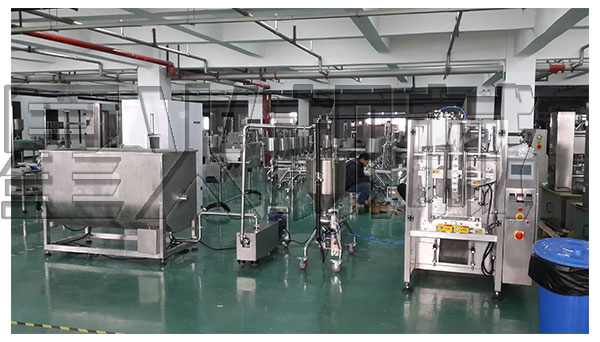全套全自動(dòng)火鍋醬料包裝機(jī)械車(chē)間展示圖