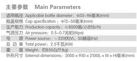 適用不同規(guī)格圓瓶、方瓶的外蓋自動(dòng)旋合,具有結(jié)構(gòu)緊湊、操作簡(jiǎn)單,調(diào)整規(guī)格方便快捷的特點(diǎn)。