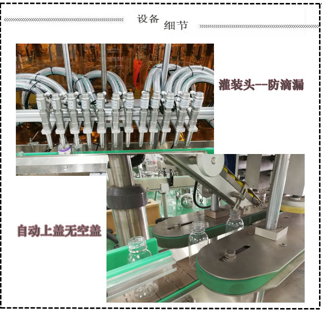 2、采用防高泡產品的灌裝升降系統(tǒng)、雙重防滴漏與拉絲的灌裝悶頭、確保瓶口定位的液位控制和定位系統(tǒng)。